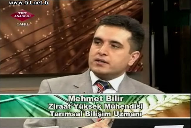 Sitemiz teknik sorumlusu Mehmet BıLıR TRT´nin konuğu oldu. Kemal Erdoğan ve Emre Yörük´ün de Türkiye´de bilişim, internet ve teknoloji kullanımı, bunun tarım sektörüne yansımaları, tarım sektöründe kullanım olanakları, bilişim teknolojilerinin sektöre sağlayacağı kolaylıkların ele alındığı programda varolan teknolojiler ile yakın zamanda beklenen teknolojiler değerlendirildi. Avrupa ve dünya ülkeleri ile kıyaslamaların da yapıldığı programda Mehmet Bilir, bugüne kadar çok mesafeler katedildiğini, ancak verimli bir şekilde bilişim teknolojilerinin kullanılabilmesi için mevcut projelerin koordineli çalıştırılabilmesi ve yeni ortaya konulacak teknolojilerin de birbirinden bağımsız platformlar yerine birbiri ile haberleşebilen ortamlarla hizmetlerin sunulmasının önemli olduğunu vurguladı.